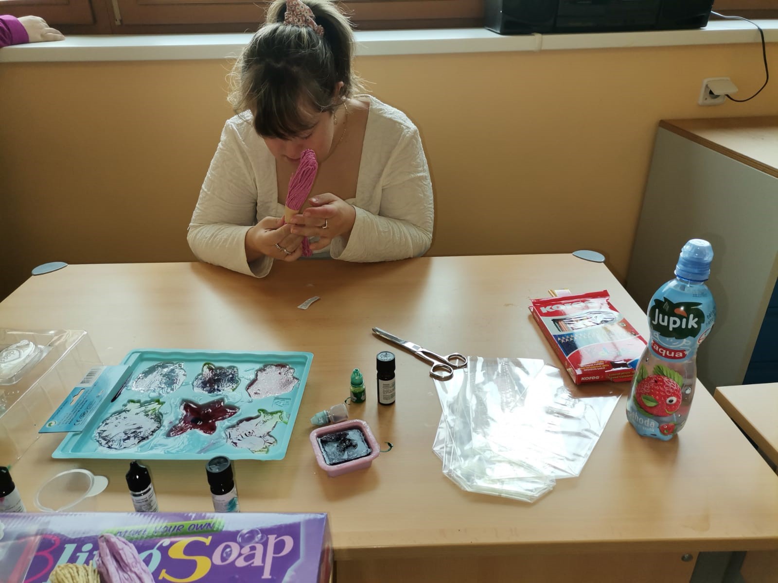 Z daru města Štěpánova byla zakoupena sada na výrobu mýdel a svíček. Klientka navštěvující denní stacionář Slunovrat byla verbálně podporována, aby co nejvíce pracovala samostatně. Po rozpuštění hmoty nad vodní párou byla nalita do připravených formiček. Ve formičkách klientka hmotu obarvila barvami, které si vybrala a následně je nalila do formy. Poté ještě některé mýdla ozdobila třpytkami. Ztuhlá mýdla s pomocí zaměstnance zabalila do sáčků. Klientka si celý postup výroby mýdel velmi užívala. Vznikl tak krásný a s láskou dělaný dárek.