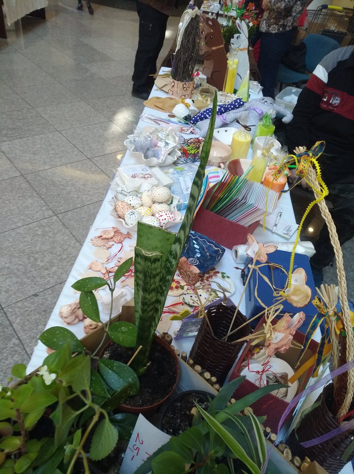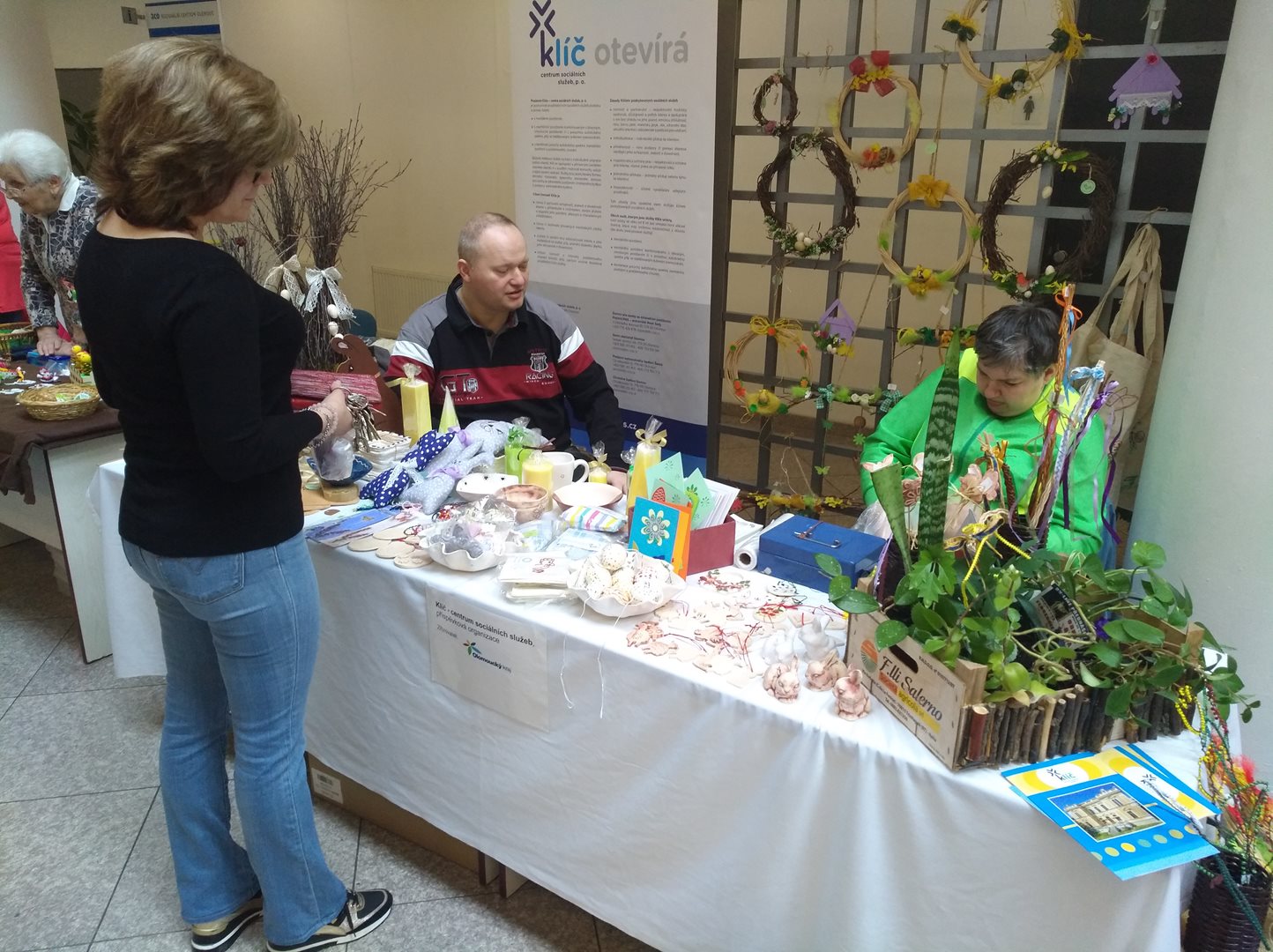 Velikonoce klepou na dveře a počasí několika posledních dní nás již navnadilo na jaro. Jako každý rok v tomto čase využili klienti Klíče možnost a ve středu 22. března se zúčastnili tradičního a oblíbeného velikonočního jarmarku v Regionálním centru Olomouc na Jeremenkově ulici. Prodávali zde své výrobky a současně prezentovali veřejnosti organizaci Klíč – CSS, p. o. Výrobky z dílen v denním stacionáři Domino byly pro letošní rok obohaceny o zdobené prostorové dekorace z březového proutí a drátované koše, které se setkaly u zákazníků s velkým úspěchem. Nechyběly ani různé jarní věnce z přírodnin, výrobky ze dřeva, veselá velikonoční přání, užitková keramika, drobné keramické ozdoby, svíčky, vyšívaná prostírání a pokojové květiny vypěstované klienty v zahradnické dílně. Výrobky klientů obstály v konkurenci a zákazníkům se líbily. Na jarmarku byly dále prezentovány výsledky terapeutických aktivit uživatelů sociálních služeb poskytovaných příspěvkovými organizacemi Olomouckého kraje a klienti si je nejen prohlédli, ale také si sami pořídili drobnost pro radost.