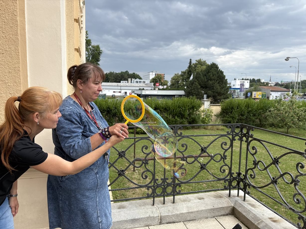 Příjemným zpestřením celé akce byla interaktivní aktivita s bublifukovou pistolí a tvorba obřích bublin, která u klientů vyvolala pozitivní emoční odezvu a podporovala jejich smyslovou stimulaci i motorickou koordinaci.