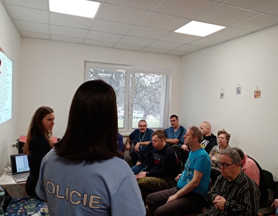 V denním stacionáři proběhla zajímavá a přínosná návštěva policistek z oddělení tisku a prevence. Ty si pro klienty připravily poutavou prezentaci zaměřenou na základní bezpečnostní témata a orientaci v běžných pojmech, se kterými se mohou setkat v každodenním životě. Během setkání policistky srozumitelnou formou vysvětlily rozdíl mezi pojmy jako trestný čin a přestupek či noční klid, trestní odpovědnost a trest. Uvedly také praktické příklady z praxe. Klienti se dozvěděli, v jakých situacích je vhodné obrátit se na policii a jak správně postupovat při řešení různých problémových situací. Součástí prezentace bylo také připomenutí významu tísňových linek a vysvětlení, kdy je vhodné tyto linky využít, jak probíhá identifikace občana při policejní kontrole, a objasnili, jaké mají občané v takové situaci povinnosti i práva. Setkání probíhalo v přátelské atmosféře a klienti měli možnost klást otázky a sdílet své zkušenosti. Návštěva byla velmi přínosná a pomohla účastníkům lépe se zorientovat v tématech souvisejících s bezpečností a činností policie.